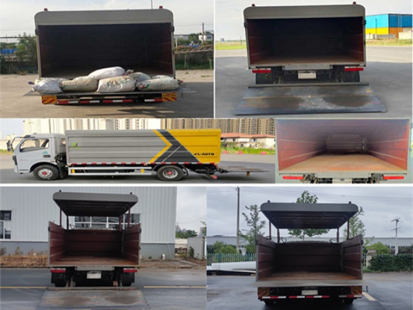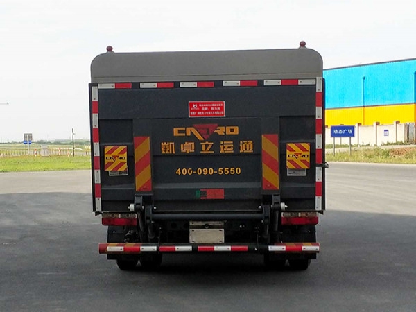 其它 | 1.該車裝備有垃圾箱體,液壓升降頂蓋,液壓尾板等專用裝置,用于實現(xiàn)垃圾桶的裝卸及運輸功能,頂蓋可向上開啟;2.尾板質(zhì)量為:450kg,尾板收起的水平狀態(tài)為:200mm;3.側(cè)面防護裝置材料為鋁合金,連接方式為螺栓連接,后下部防護裝置為圓形管材料為Q235B,連接方式:螺栓連接,后部防護裝置截面尺寸為直徑110mm,離地高度:440mm;4.儲能裝置類型/生產(chǎn)廠家:磷酸鐵鋰電池/寧德時代新能源科技股份有限公司;電機額定功率/峰值功率:60kW/110kW;5.ABS型號/生產(chǎn)廠商為:ABS/ASR-12V-4S/4M/襄陽東風隆誠機械有限公司.6.該車型可選裝車載ETC裝置;7.該車型選裝不同尺寸的垃圾箱體,標準型時整車長:6650mm,整車寬為:2100mm/2140mm,整車高:2520mm,后懸:1672mm加長型箱體時整車長:6750mm/6850mm,整車寬為:2140mm/2200mm,整車高:2615mm/2710mm,后懸:1772mm/1872mm,標準型與加長型箱體整備質(zhì)量在誤差范圍內(nèi),忽略不計;8.該車型可選裝輕量化箱體,整備質(zhì)量/額定載質(zhì)量:5200kg/3100kg,隨底盤選裝駕駛室外觀.選裝后部外觀結(jié)構(gòu) | ||