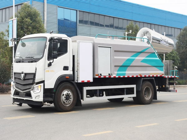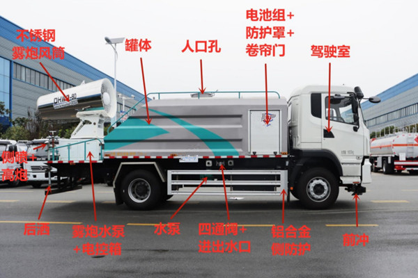 我公司抑塵車標配:前對沖、后灑、側噴、后置式工作平臺、平臺上有高壓水炮(可 360°旋轉,可調成柱狀最大射程 35 米,也可調成霧狀最大射程 15 米,(可調成: 直沖狀、大雨、中雨、小雨、毛毛雨),配備優質大功率專用灑水泵,雜物過濾網,國標通用 65 型消防接口(可通過消防栓加水),2 根引水膠管。水泵、取力器、球閥、濾網均為國家標準產品,主管道加粗,法蘭墊、法蘭盤加厚,前對沖,大通徑球閥,具有性能優良,工作可靠、效率高、流量大。尾部加裝霧炮能有效的對霧霾、灰塵進行有效的抑制效果。我公司生產的多功能抑塵車,利用水霧吸附空氣中的粉塵,淡化空氣中的污染顆粒物濃度,達到(固塵、降塵、清潔凈化空氣)的效果,有效緩解城市塵粒空氣污染現象并可用于公共場所(增濕、降溫、消毒、除臭)。可以改善空氣質量,用于降低 PM10、PM2.5,被譽為 PM2.5 治理神器。同時也可以改善工礦作業物料堆放、建筑施工和爆破拆除引起的灰塵污染,亦可用于城市大氣治理、農藥噴灑、消毒等。
