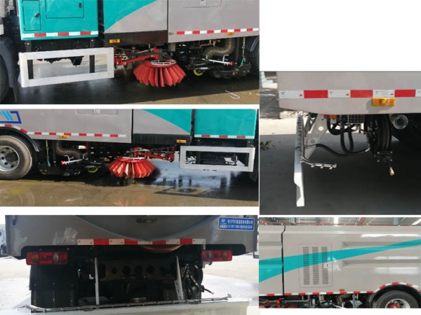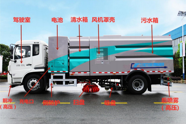 3、洗掃車采用東風(fēng)純電動二類汽車底盤改裝,加裝風(fēng)機(jī)、高壓水泵、清水箱、垃圾箱、左右立掃、帶噴水桿的寬吸嘴、掃盤降塵系統(tǒng)、液壓系統(tǒng)、專用裝置電控系統(tǒng)和副車架等改裝而成。